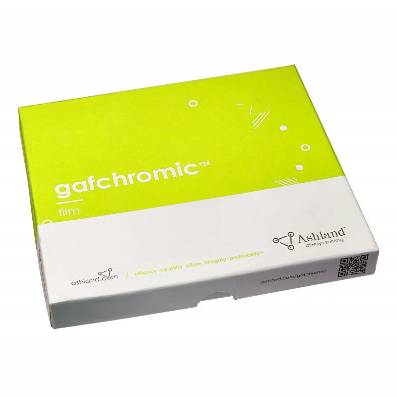Box of 25 GAFCHROMIC – ASHLAND model EBT4 films – 20.32 cm x 25.4 cm (8″ x 10″) specifically designed for patient dosimetry and QC machines on a dose range of 0.2 Gy to 10 Gy. GAFCHROMIC films are easy to cut, light-tight, and self-developing.