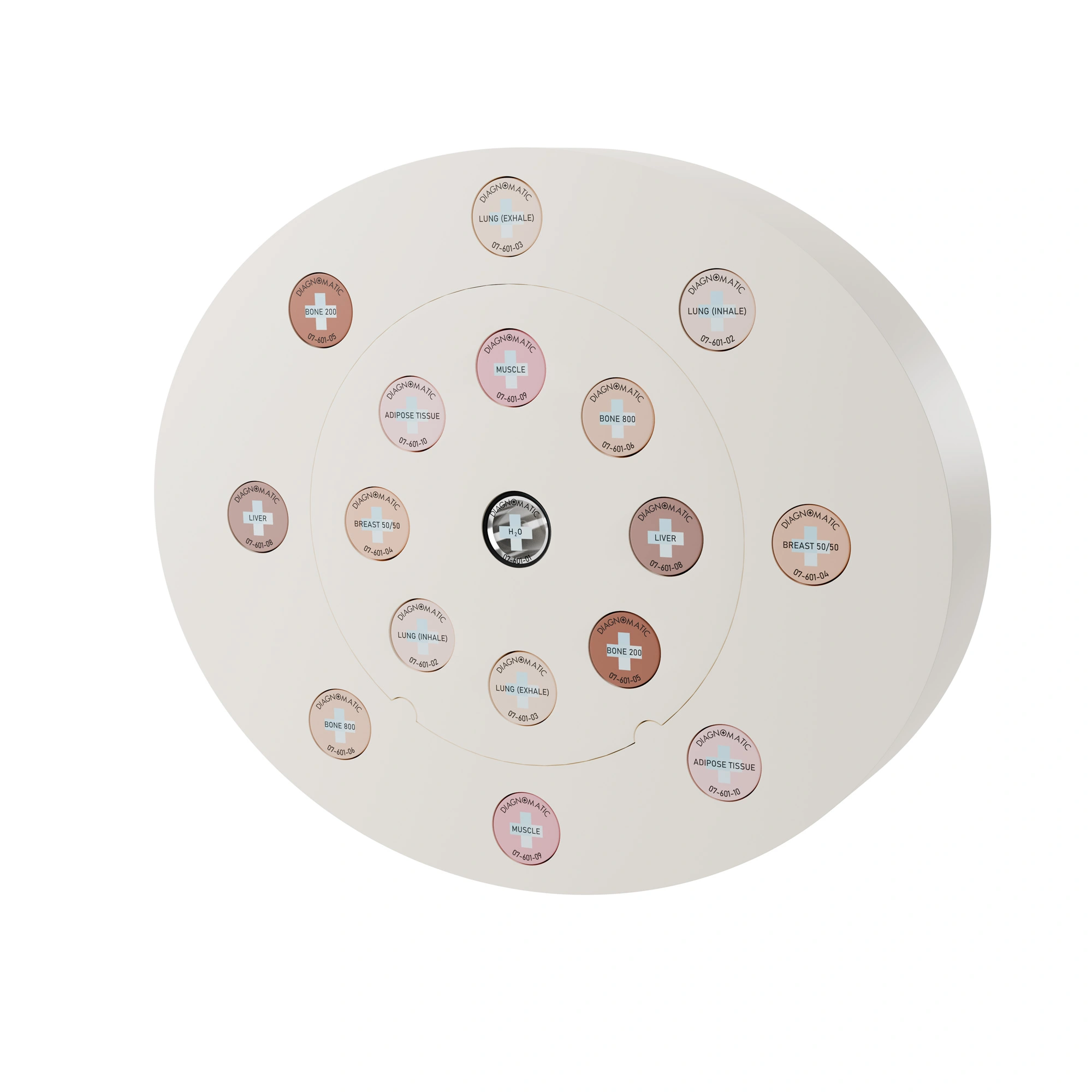 Le fantôme Pro-RT ED permet de prendre en compte l’hétérogénéité tissulaire lors de la planification des traitements de radiothérapie. Il permet de définir la corrélation précise entre les données tomodensitométriques et la densité électronique de différents tissus. Le fantôme se compose de deux disques emboîtés représentant la tête et l’abdomen. Neuf inserts de densité électronique équivalente à différents tissus peuvent être positionnés à 17 emplacements différents dans le champ de balayage. Un insert peut être rempli avec n’importe quel liquide. Des inserts marqueurs de distance (en option) permettent une évaluation rapide de la précision de mesure des distances du scanner.